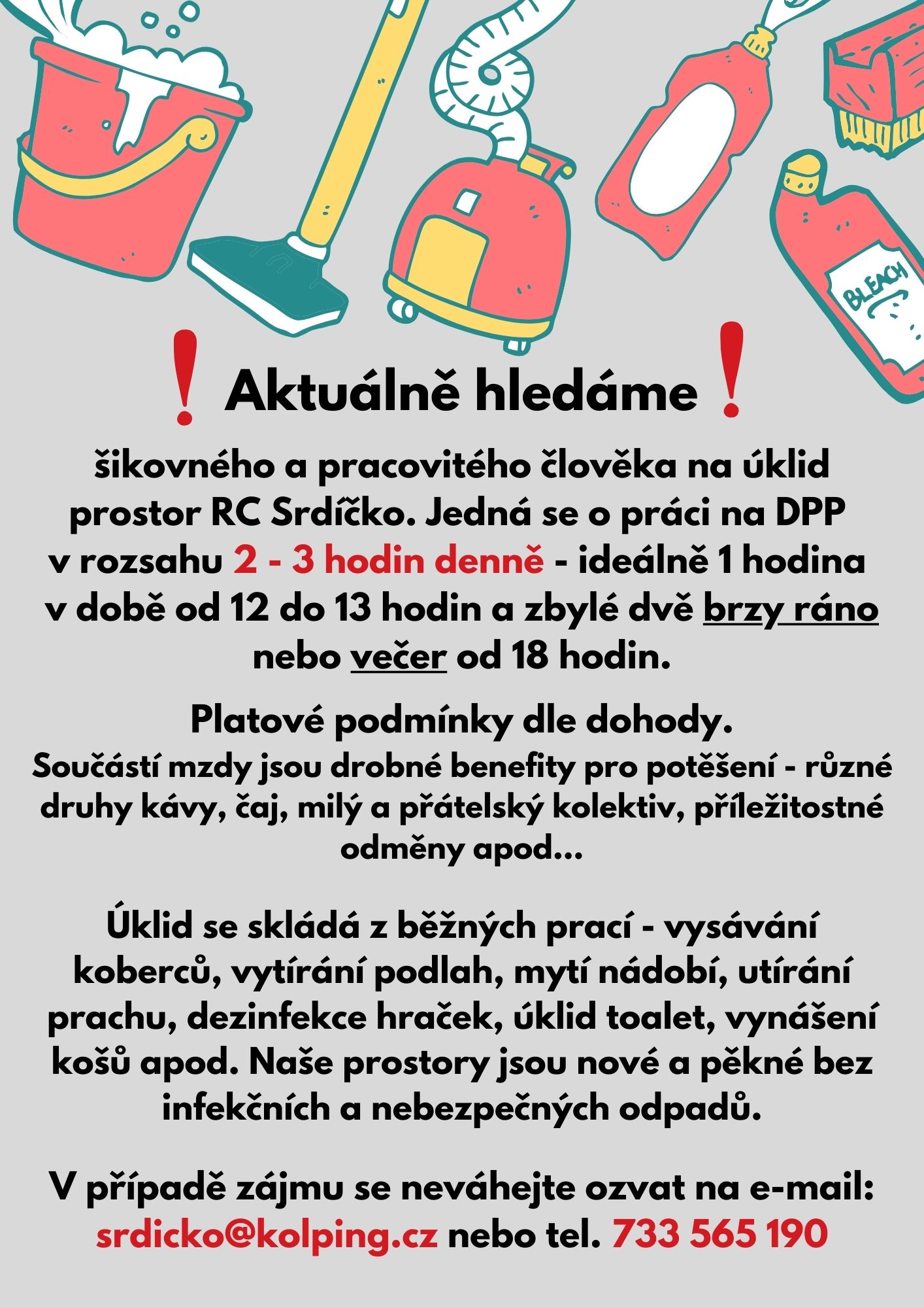 Od dubna přijmeme pracovníka na DPP, který bude mít na starost úklid Srdíčka.