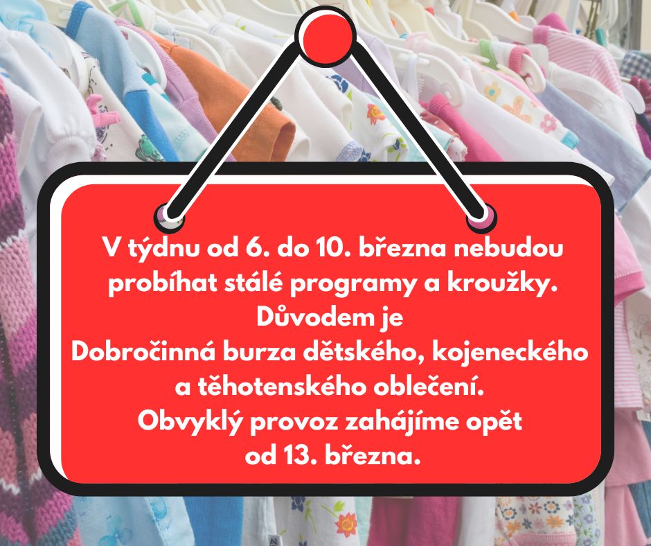 V týdnu od 6. do 10. března nebudou probíhat obvyklé programy, na které jste u nás zvyklí. Důvodem je konání Dobročinné burzy dětského, kojeneckého a těhotenského oblečení. Více informací o burze naleznete ZDE.