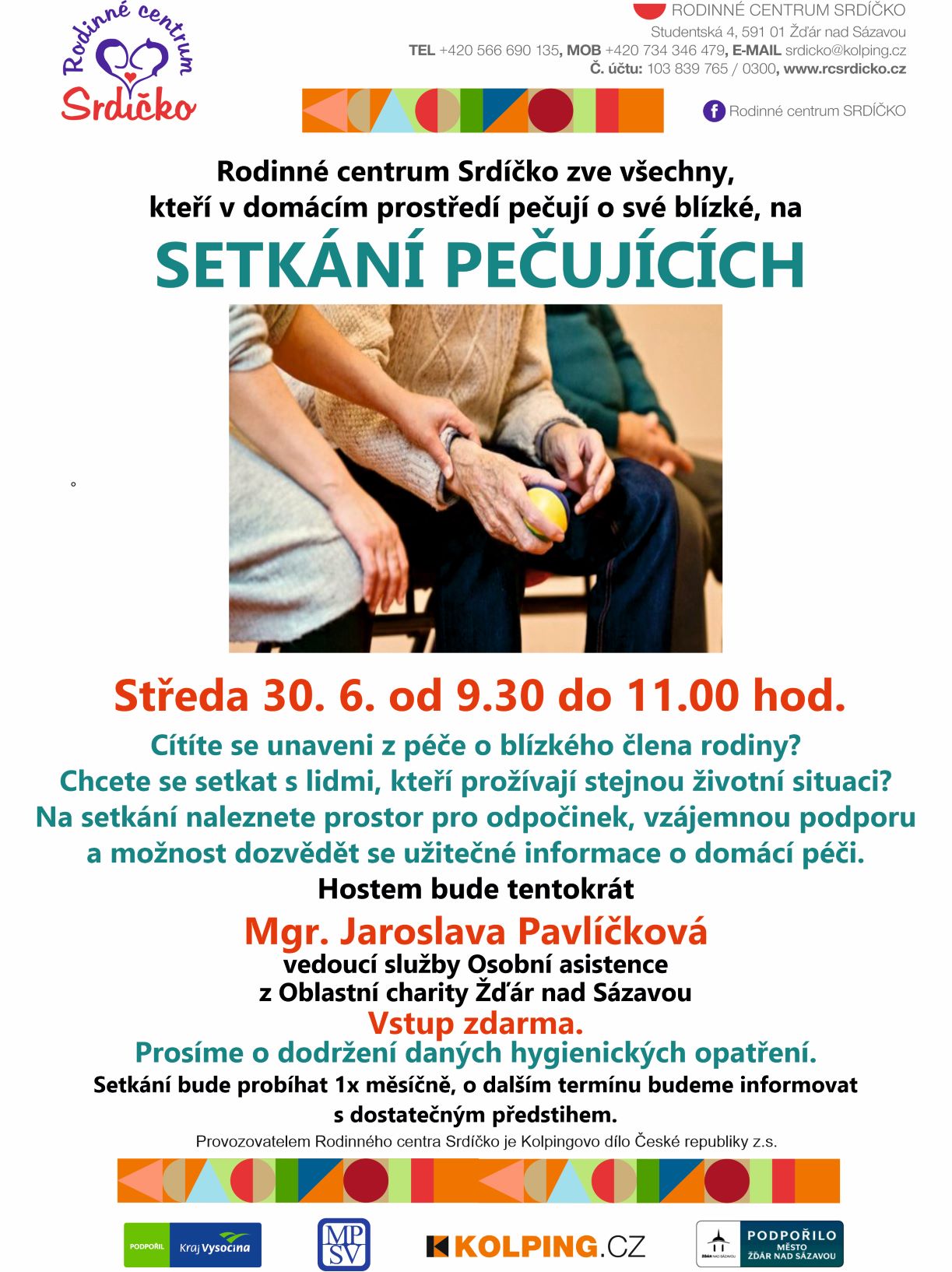 Cílem setkávání je možnost neformálního sdílení zkušeností pečujících, vzájemná podpora a také prostor pro odpočinek. Hostem tohoto setkání bude Mgr. Jaroslava Pavlíčková, vedoucí služby Osobní asistence z Oblastní charity Žďár nad Sázavou. Uvítáme nahlášení předem na tel. č. 732 472 892.