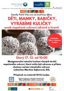17pro10:0012:00Děti, mamky, babičky, vyrábíme kuličky...aneb nepečené cukroví zdravě a hravě.